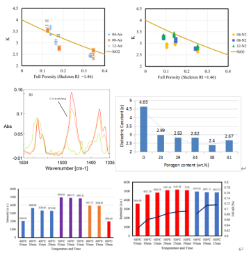 本团队对集成电路先进制造工艺中的互连工艺开展研究,开发了制备具有低介电常数的互连介质薄膜工艺,并基于该薄膜结构开展了发光材料研究、忆阻器件、传感检测等多方面的应用研究。采用溶胶-凝胶技术和旋涂工艺分别采用BTMSE/MTMS和TEOS/MTEOS制备出两大类基于表面活性剂模板的OSG低k薄膜;通过有机合成制备了苯桥连有机硅烷前体,得到三乙氧基甲硅烷基苯,通过通过旋涂和蒸发诱导自组装工艺基于基于表面活性剂模板制备出了苯基OSG薄膜,该薄膜结构在具有较低介电常数的基础上保障了较好的机械性能;探索了基于多孔结构薄膜进行的发光、检测等领域的应用,进一步拓展了该薄膜制备技术的应用领域。