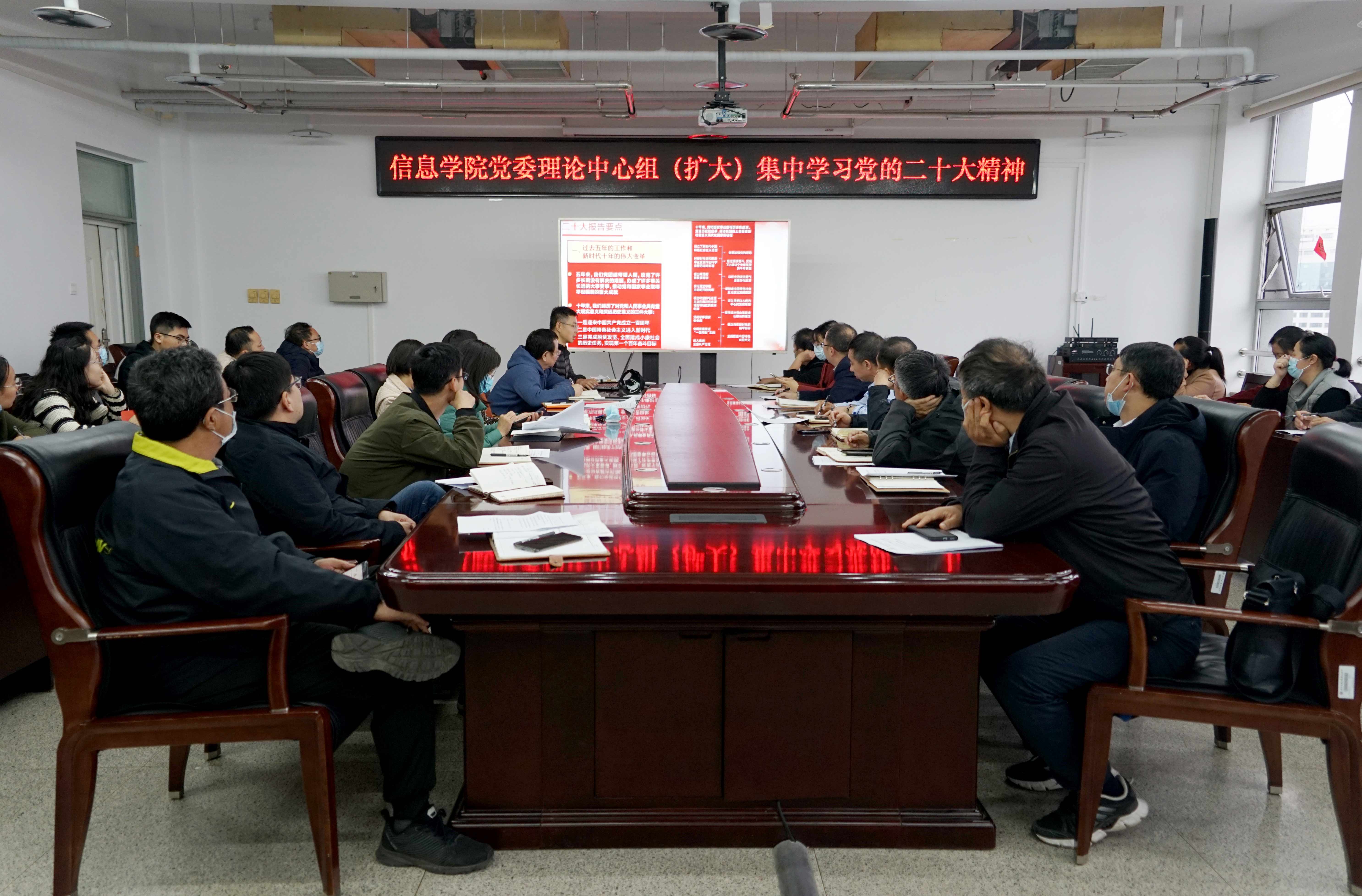 10月27日,beat365官方网站党委理论学习中心组(扩大)在瀚学楼1014召开学习会,集中学习党的二十大报告,学院党委书记王月海主持会议并进行领学。学院党委委员、系主任、党支部书记参加了学习。