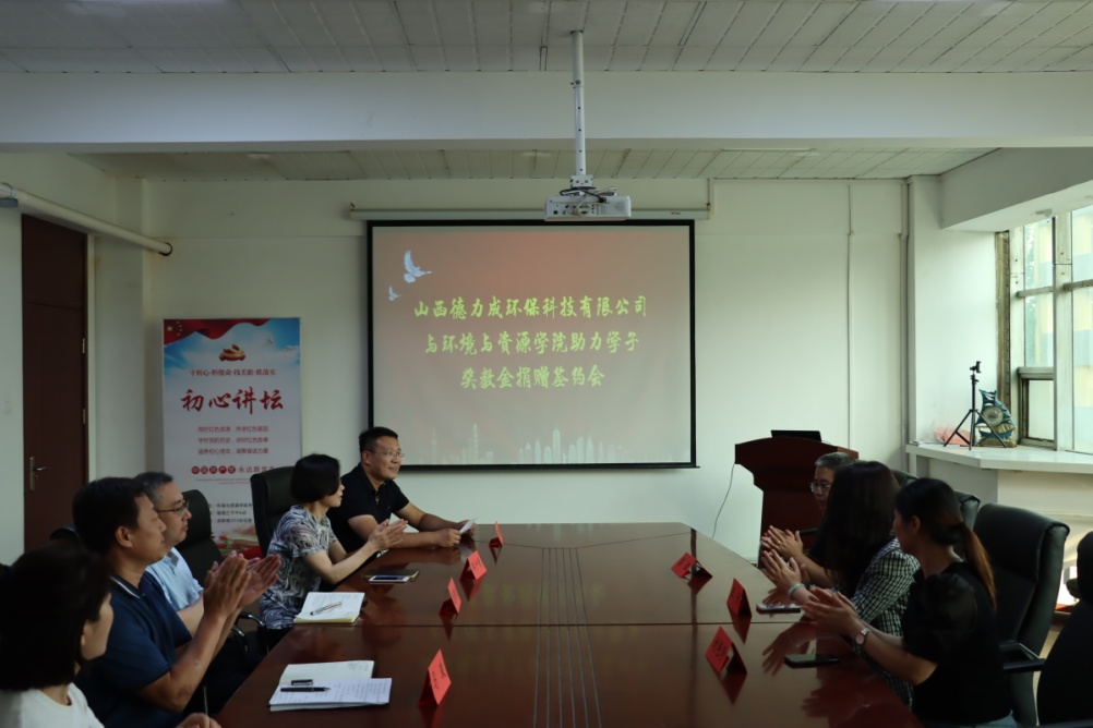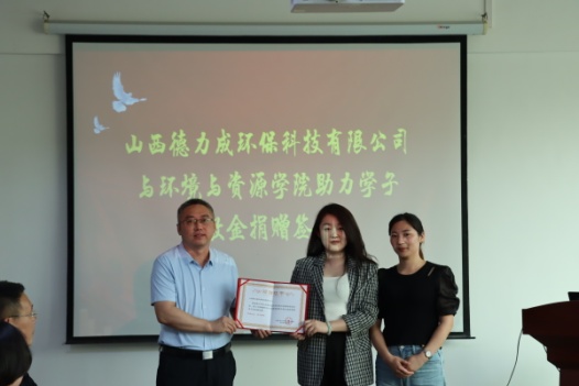 最后,郭少青院长代表学院接受了山西德力成环保科技有限公司“德力成”奖教学金。兰国生书记代表学院向山西德力成环保科技有限公司颁发捐赠证书。