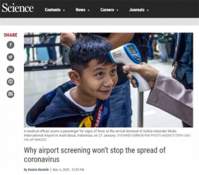 2020/03/13《科学》杂志发文称,机场入境筛查很难阻止冠状病毒传播,入境检查中发现感染的乘客极为罕见,即使偶然发现了病例,对疫情暴发过程几乎没有影响。