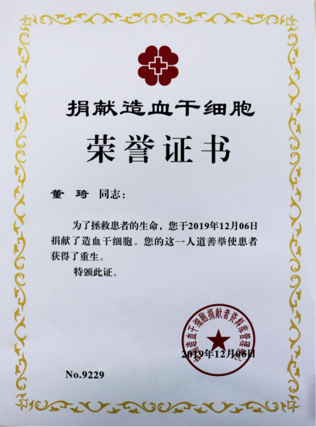捐献造血干细胞荣誉证书