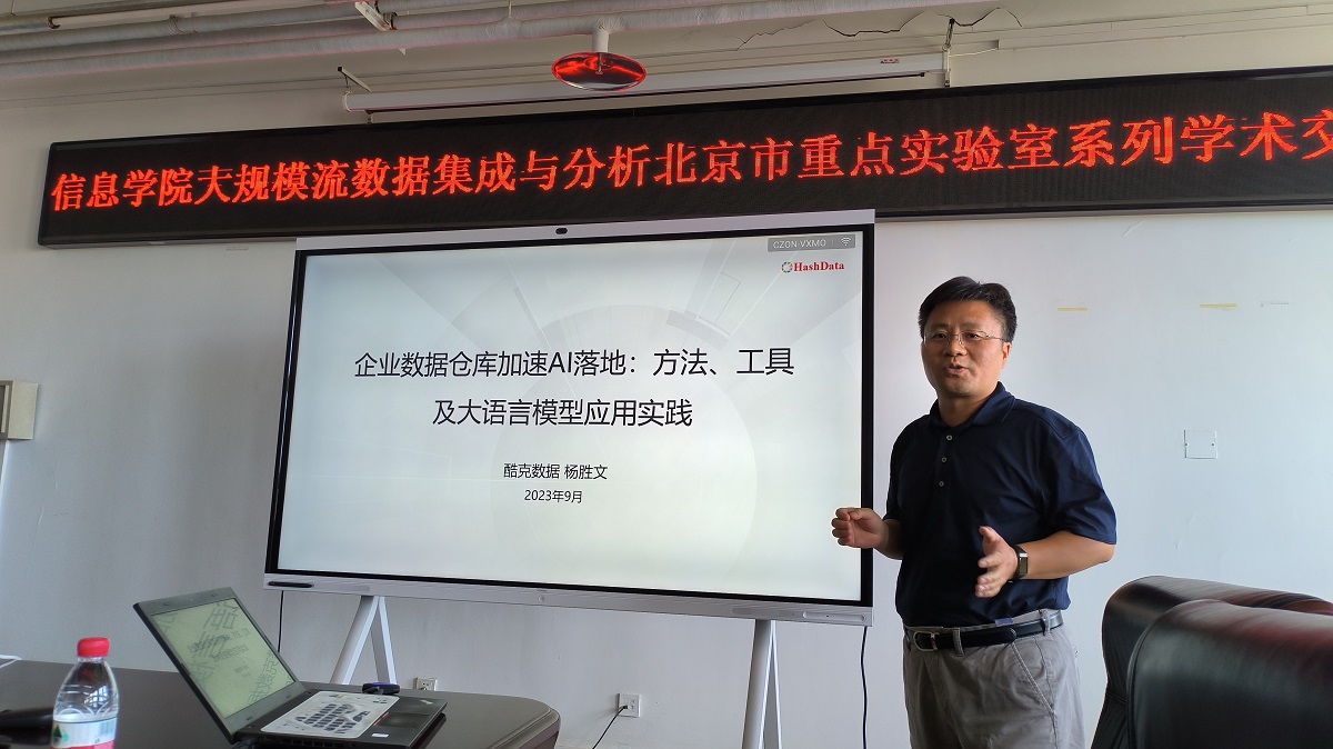2023年9月20日上午,beat365官方网站大规模流数据集成与分析技术北京市重点实验室邀请了酷克数据首席科学家杨胜文博士进行了题为“企业数据仓库加速AI落地:方法、工具及大语言模型应用实践”的学术报告和交流。本次报告由实验室的王桂玲研究员主持,实验室主任韩燕波教授代表实验室师生对杨胜文博士表示了热烈的欢迎,beat365官方网站七十多位同学参加了此次学术活动。